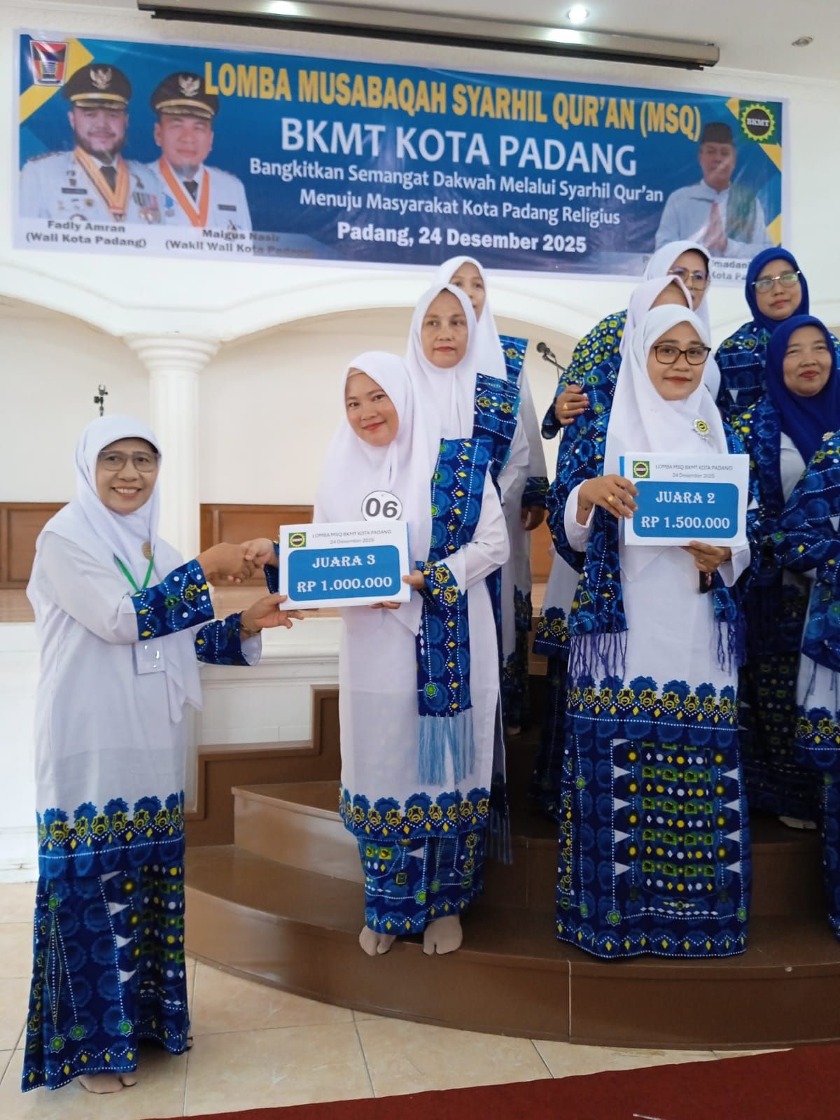 Dengan perolehan nilai tertinggi dan konsistensi di setiap instrumen penilaian, Kecamatan Bungus Teluk Kabung resmi dinobatkan sebagai Juara Pertama MSQ BKMT Kota Padang tahun ini. Sorak sorai pendukung dan takbir langsung membahana saat penyerahan hadiah dan apresiasi pemenang lomba.