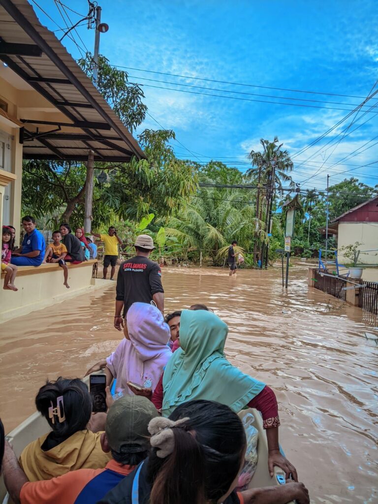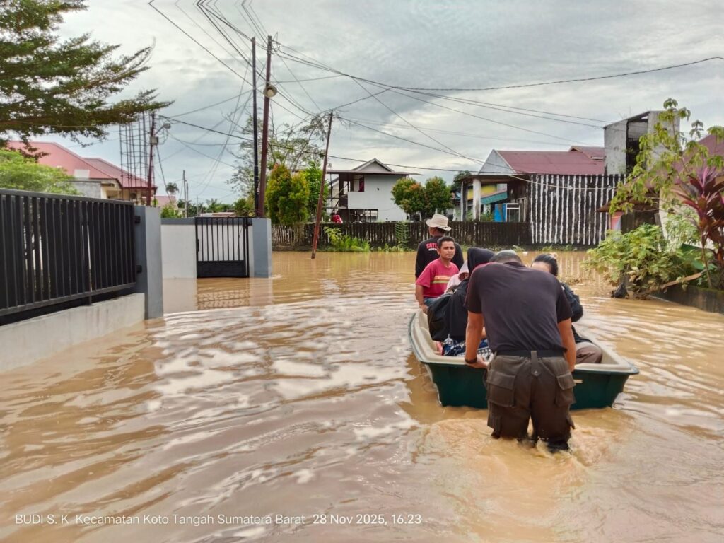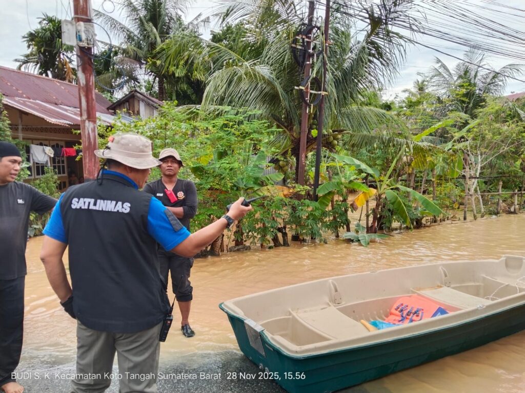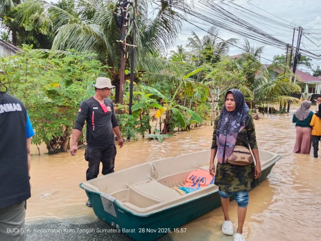Sentral.cfd ‖ Padang – BPBD Kota Padang bersama tim gabungan melakukan evakuasi warga yang korban banjir dengan menggunakan perahu karet, di Parak Jambu, Dadok Tunggul Hitam, Padang (28/11/25).